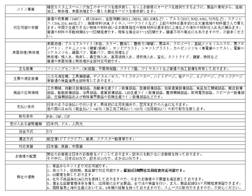 - 春節休業期間のお知らせ(2026年)弊社は各種類の機械部品、設備部品、工作機械部品、治具関連などの素材から、表面処理まで一貫した製造サービスを提供できる会社です。単品からロットまで全部対応可能です。弊社には輸出ライセンスを持っておりますので、日本語対応可能です。 もし機械部品加工などのご要望がございましたら、いつでもご用命下さい。